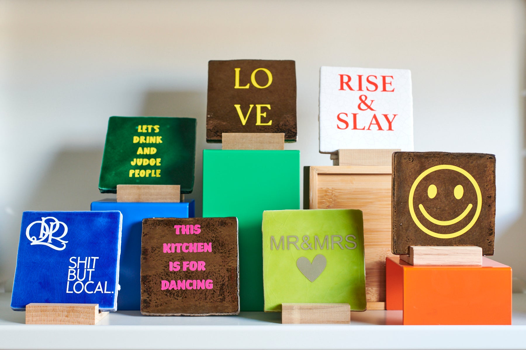 Create your own QUOTE ME BABY tile with a phrase of your choosing. Pick your tile colour and text colour, add a wooden holder or cork coaster backing ready to boost your space.